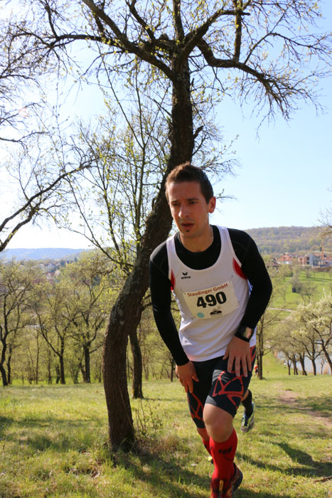 Ich merke wie ich langsam von hinten eingeholt werde. Den ersten steilen Abschnitt mit einer Steigung von ca. 15% laufe ich nicht, sondern gehe ich gleich hoch, da man bei solch steilen Passagen im Gehschritt fast genauso schnell, wie im kräftezehrenden Laufschritt, ist. Mein Verfolger holt mich zwar ein, doch nachdem er an mir vorbei war, macht er keinen Meter mehr gut. Wahrscheinlich war er durch meinen Gehschritt angespornt und hat dann gemerkt, dass ihm die Kraft ausging.