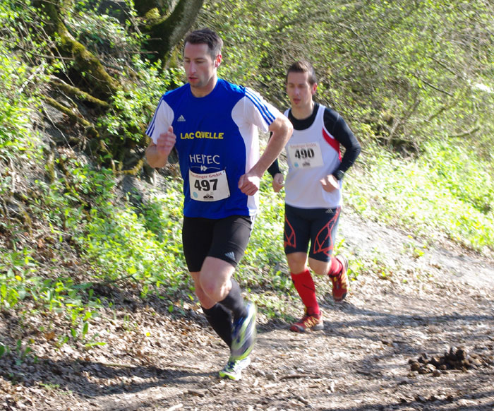 Bevor es auf das Bergplateau hoch ging, blickte ich nochmal um mich und war erstaunt, dass mein Vereinskollege Bernhard Kisch plötzlich meine Verfolgergruppe einkassierte und schnell auf mich aufschloss. Noch bevor ich das Plateau erreichte, hatte er mich einkassiert und ich versuche an ihm dran zu bleiben. Schließlich wusste ich, dass die meisten Höhenmeter nun hinter uns lagen und Bernhard bergab mir gegenüber klar unterlegen ist (siehe Hesselberglauf 2012).